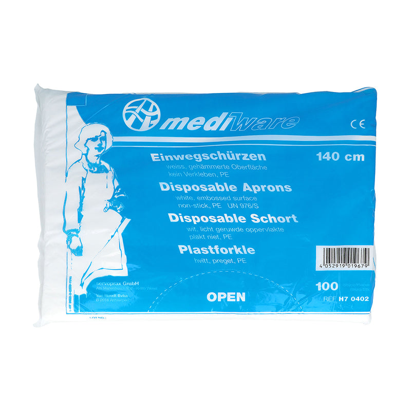 Mediware Einmal-Schürzen (weiß, aus PE-Folie) – ca. 140 cm lang, ausgestattet mit praktischen Bindebändern für sicheren Halt. Bieten zuverlässigen Schutz für Praxis und Klinik. Gewerbliche Verpackung: 100 Stück pro Beutel
