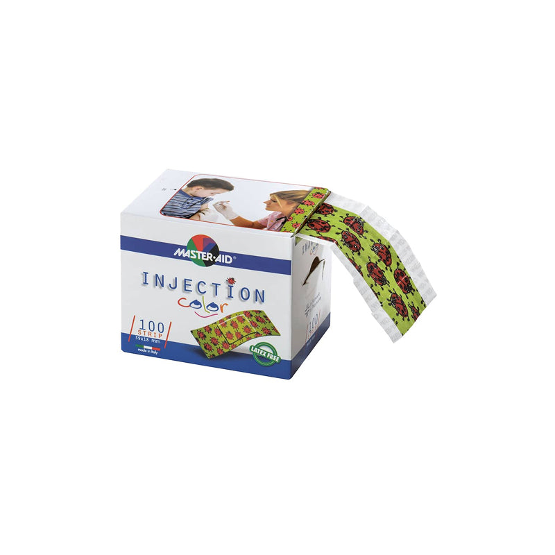 Bunte Injektionspflaster für Kinder mit niedlichen Motiven („Marienkäfer“ oder „Spooky“). Weiches Vlies (Baumwolle/Bambus), luftdurchlässig, hypoallergen, latexfrei. Rundum klebend – ideal nach Impfungen oder für kleine Wunden. 39 × 18 mm, 100 Stück je Rolle.