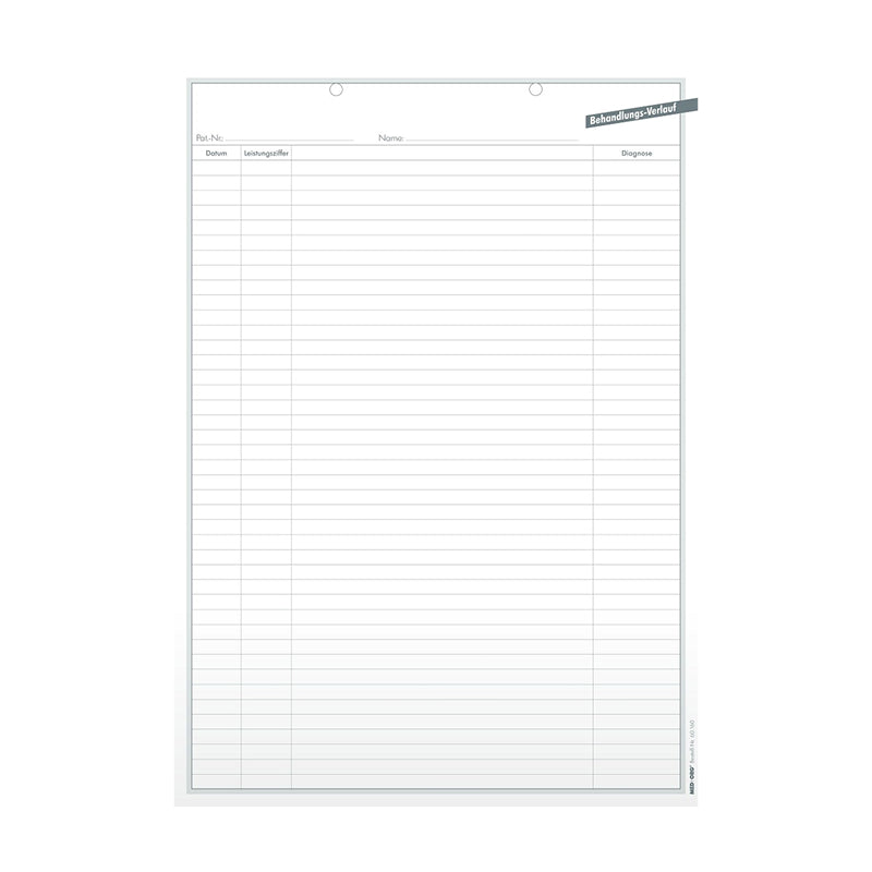MED+ORG® Einlegeblatt „Behandlungsverlauf“ – 1.000 Stück, DIN A4. Weißes, holzfreies 70 g/m² Schreibpapier, beidseitig mit 6 mm Zeilenabstand und grauer Linierung bedruckt, oben gelocht. Ideal zur nahtlosen Fortschreibung des Behandlungsverlaufs in Karteitasche
