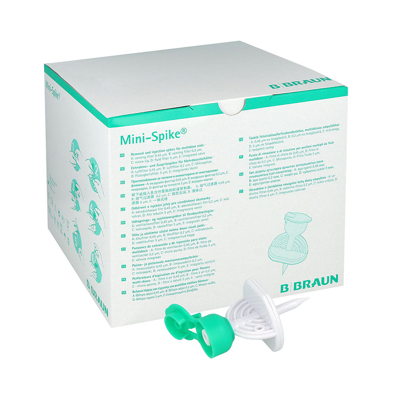 Mini-Spike mit Standard-Spitze von B. Braun – sterile Entnahme- und Zuspritzkanüle mit bakteriendichtem 0,45 µm Belüftungsfilter. Mit Luer-Lock-Anschluss und grünem Schnappdeckel für sicheres, luftblasenfreies Aufziehen von Medikamenten. Einzeln steril verpackt, zuverlässig und hygienisch.