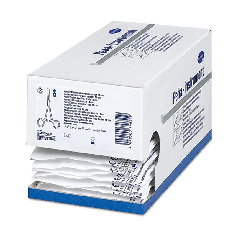 Peha-Instrument Kornzange gerade 16 cm (20er Pack) – sterile Einweg-Klemme von Hartmann aus mattem, gebürstetem Stahl. Ideal zum fixieren von Tupfern und Kompressen, besonders bei Desinfektionsanwendungen. Länge: 16 cm, silberfarbig, einzeln steril verpackt für hygienischen Gebrauch.